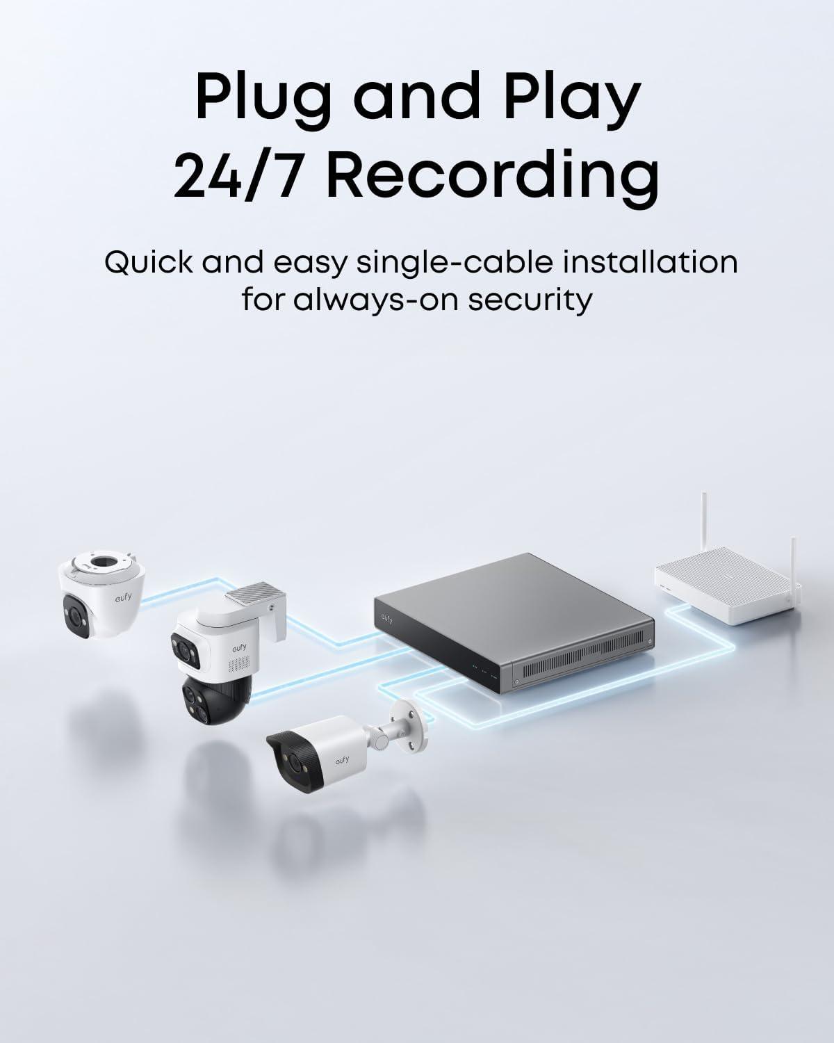 24/7 Recording with PoE: A single cable handles power and data for 24/7 recording and complete peace of mind with your eufy NVR S4. Note: PoE NVR, switch, injector, and DC adapter required (not included).